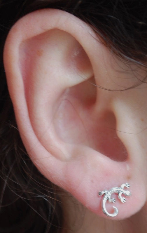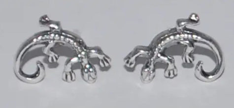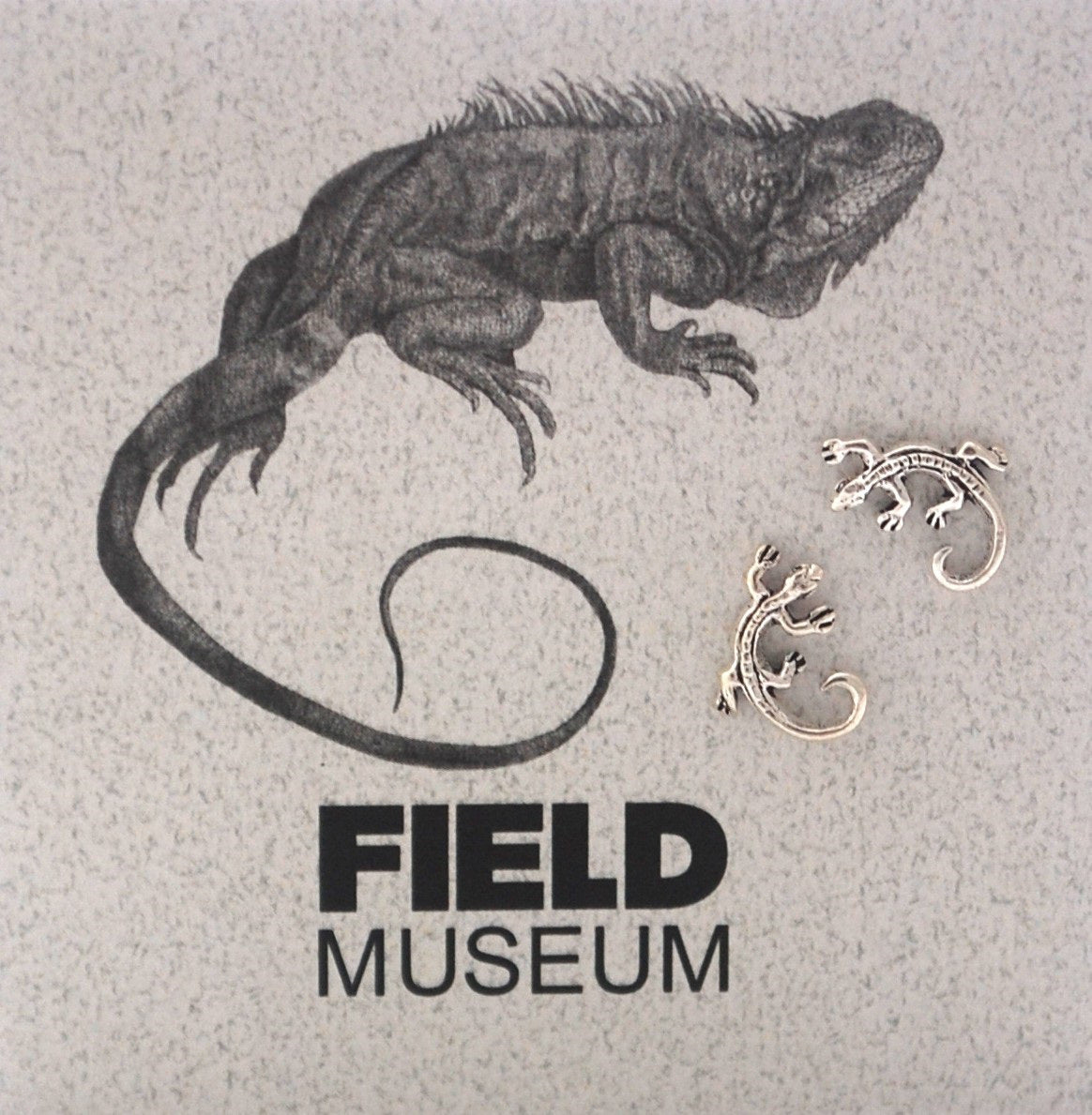 Sterling silver Iguana earrings mounted on a foldover Natural History card. Educational information about iguanas on back of card.