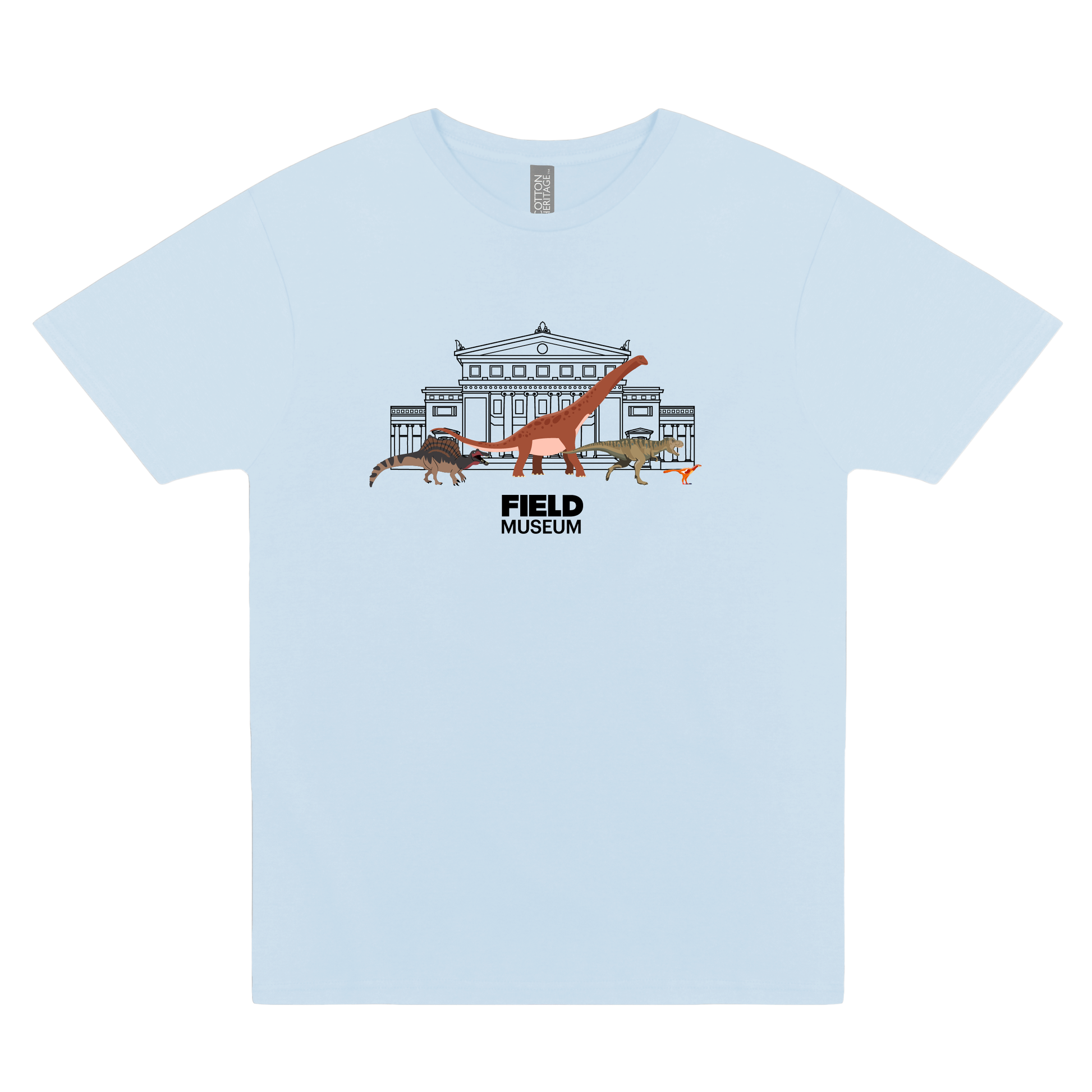 Adult tee in sizes small through 3XL. Tee color is light blue. The artwork showcases cameos of the dinosaur collection in front of The Field Museum.