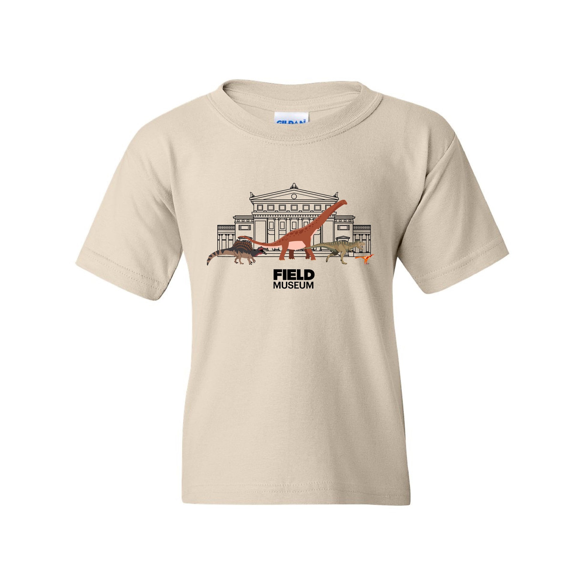 Youth tee in sizes extra small through extra-large. Tee color is natural beige. The artwork showcases cameos of the dinosaur collection in front of The Field Museum.