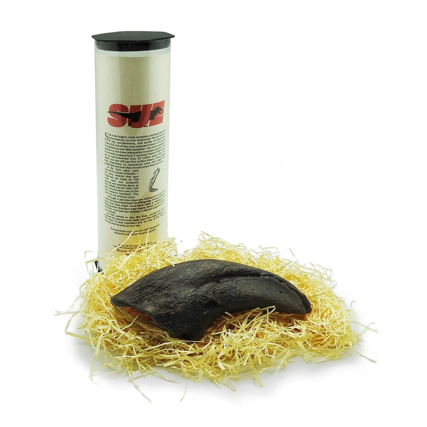 In life, SUE the T. rex's claws were covered in a sheath of keratin- the same material that your fingernails are made of. This outer layer was constantly growing and wearing down as SUE walked around. After SUE died, only the bony core of the claw became fossilized. This cast is one of those cores. Proudly display your love for dinosaurs and paleontology on your mantel, desk, or shelf with this hand-cast replica.