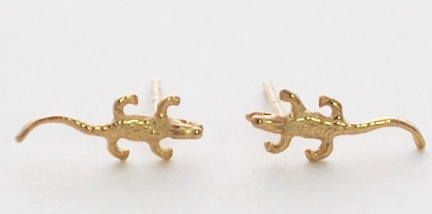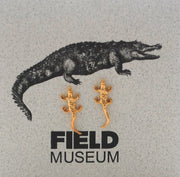 14k gold over sterling silver Alligator earrings mounted on a Natural History tent card. 5/8" length from tip to toe Educational information about alligators on back of card.